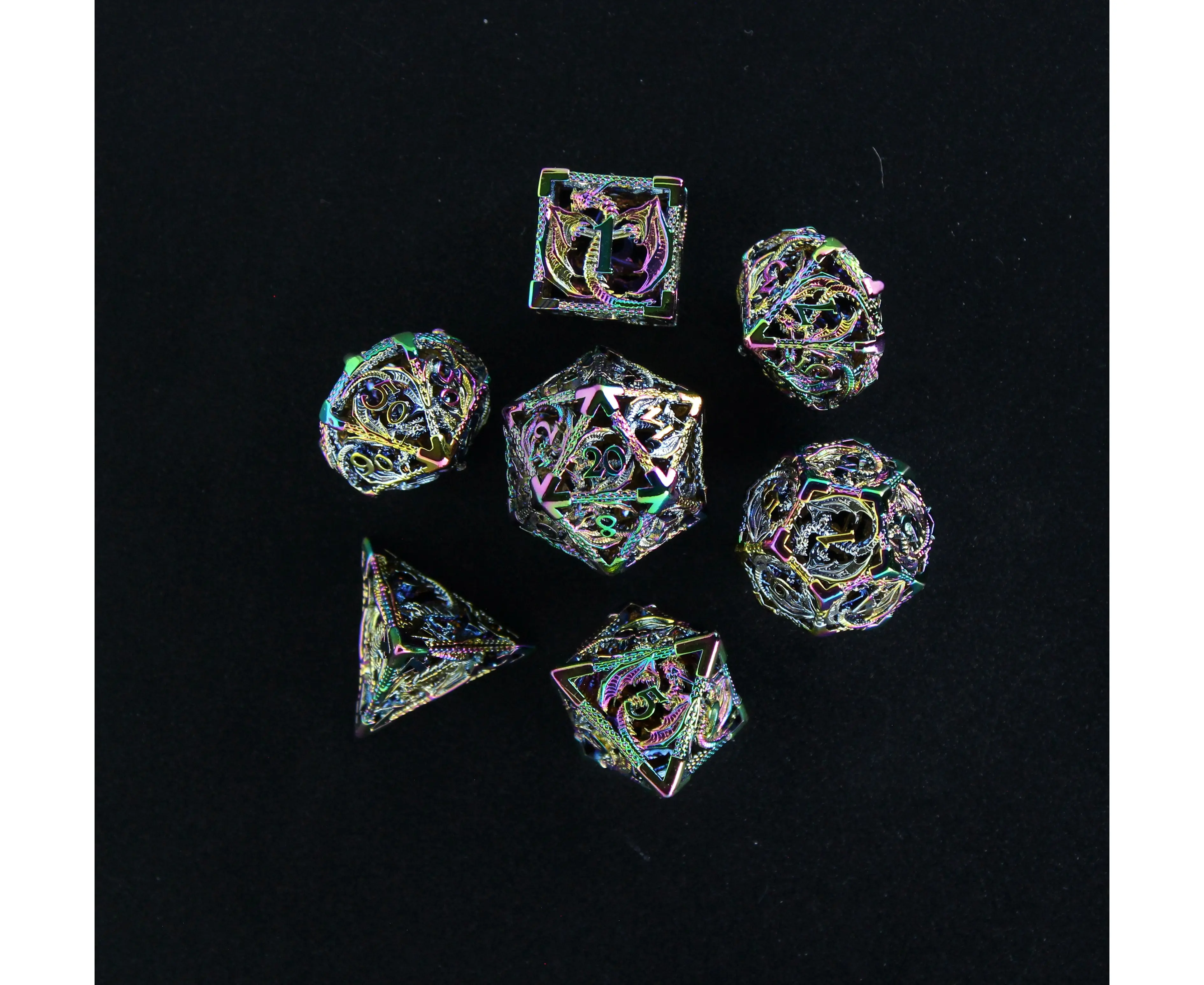 This seven-piece hollow metal dice set is detailed in rainbow tones with a lattice of a dragon on every face. Each number is suspended within the dragons, creating a striking layered design. Perfect for dragon-folk characters or just fans of dragons in general.