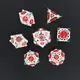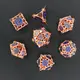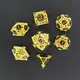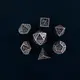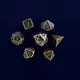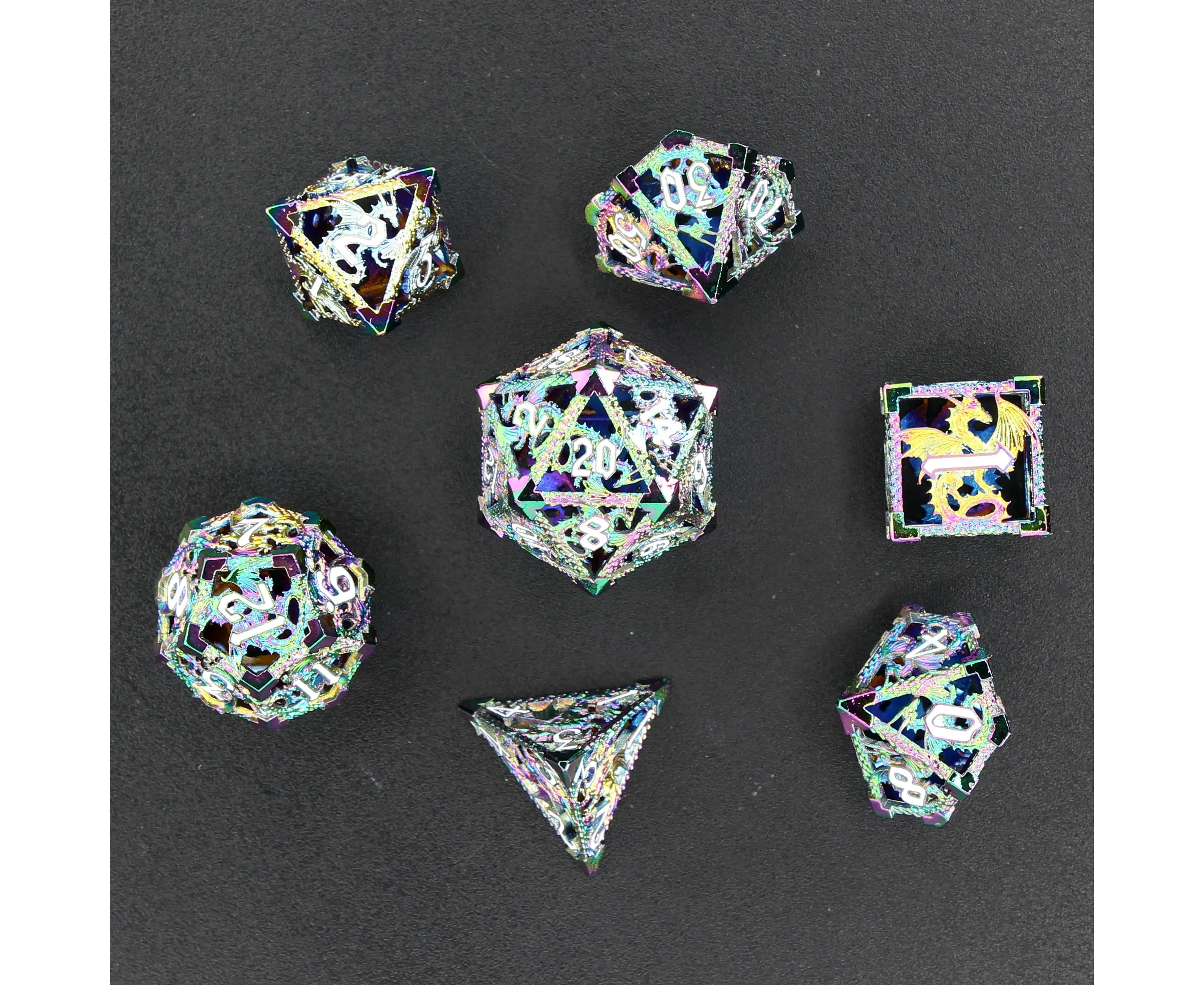 This seven-piece hollow metal dice set is detailed in rainbow tones with a lattice of a dragon on every face. Each number is suspended within the dragons, creating a striking layered design inked in white for better readability. Perfect for dragon-folk characters or just fans of dragons in general.