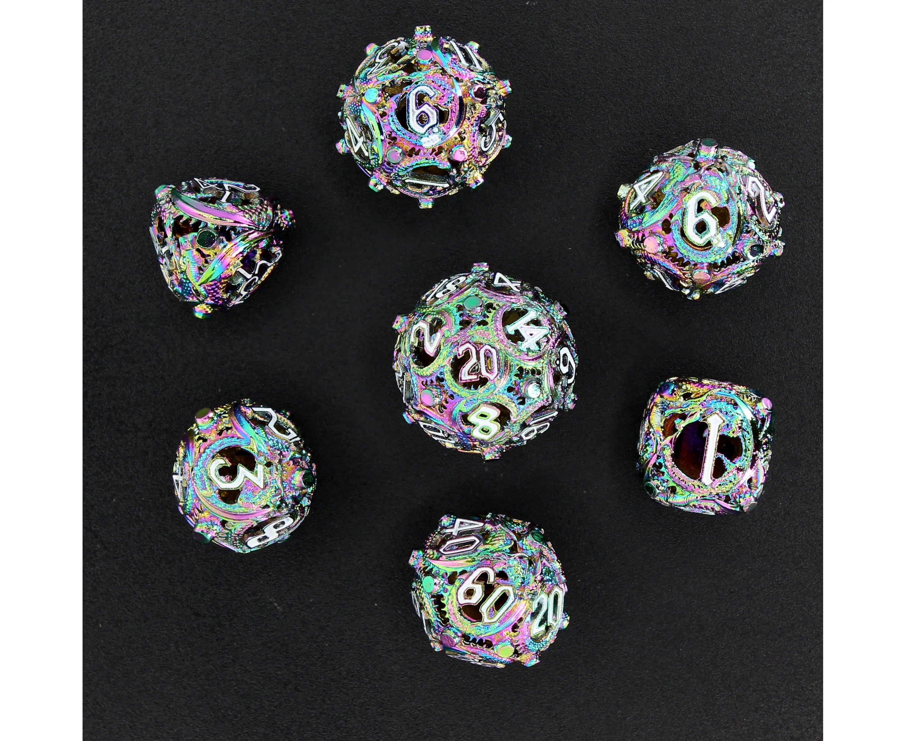 This seven-piece hollow metal dice set is detailed in rainbow tones with a lattice of spiraling dragons on every face. Each number is suspended within the dragons, creating a striking layered design. Perfect for dragon-folk characters or just fans of dragons in general.