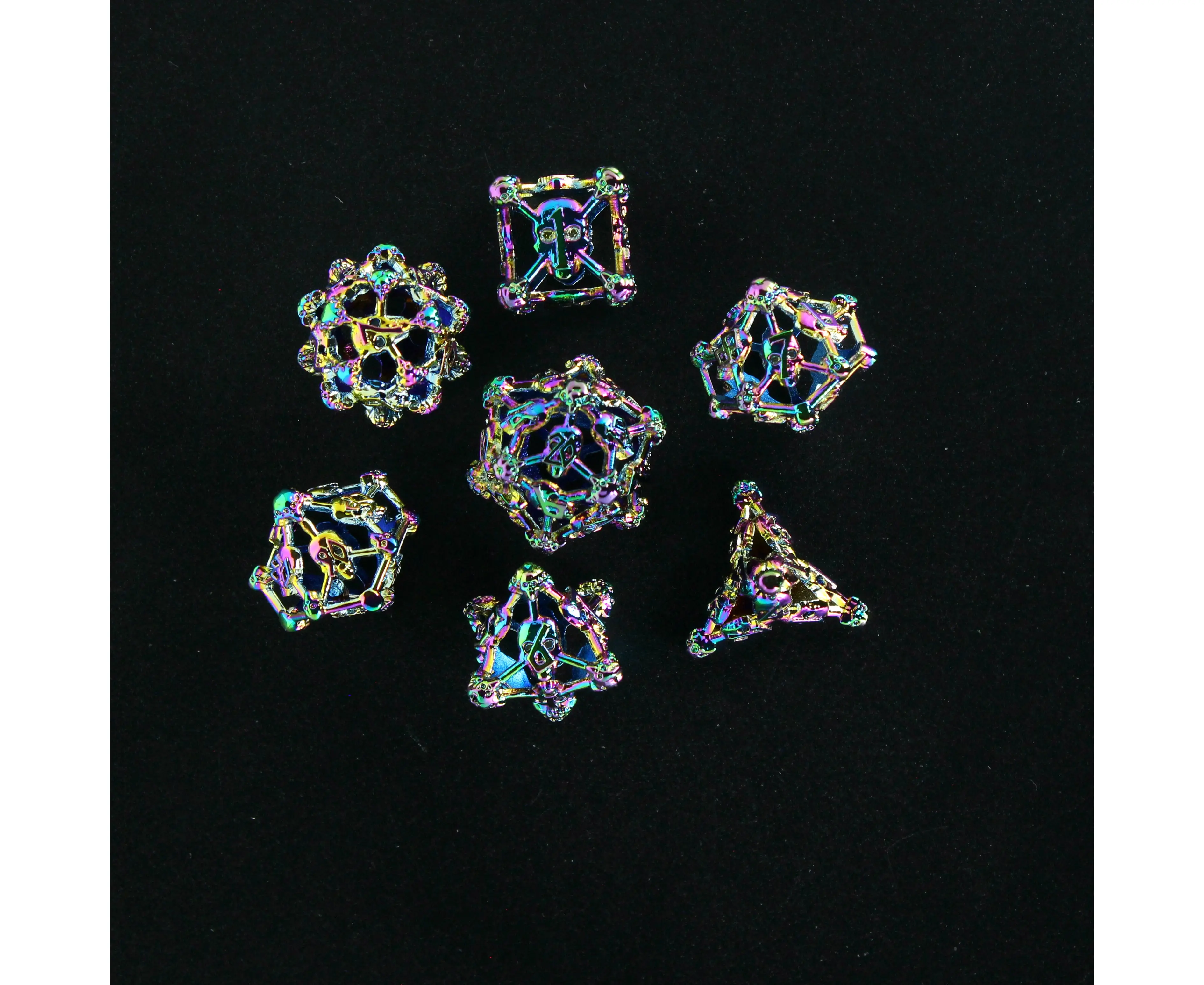 Bring a touch of grim majesty to your tabletop with this Hollow Metal Skull Dice Set. Cast in rainbow metallics, its frame formed from interlocking bars joined by grinning skulls at every point, with a lattice of smaller skulls supporting each number. Perfect for necromancers or those who like the macabre style.