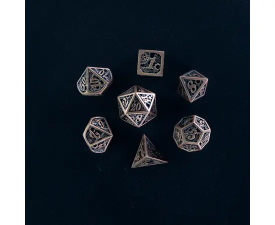 This seven-piece hollow metal dice set combines intricate craftsmanship with bold industrial style. Each die features a latticework design of copper-colored cogs, gears, and mechanical details, creating a striking steampunk aesthetic that’s both rugged and refined. Perfect for engineers, artificers, or any player with a flair for invention.