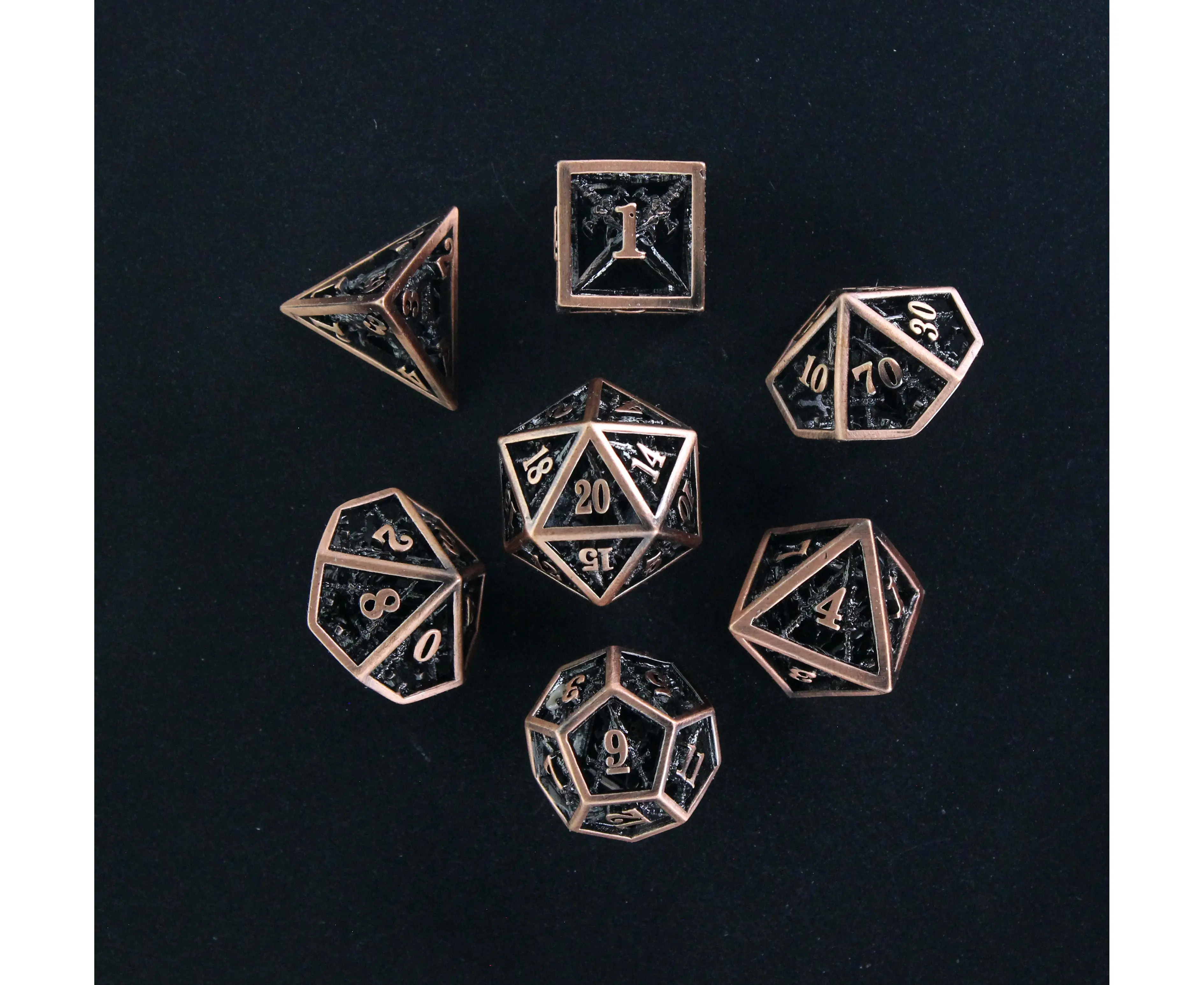 This seven-piece hollow metal dice set is detailed in Bronze-colored tones with a bold black painted lattice of crossed swords on every face. Each number is suspended within the blades, creating a striking layered design. Perfect for fighters, paladins, or anyone who lives by the blade.