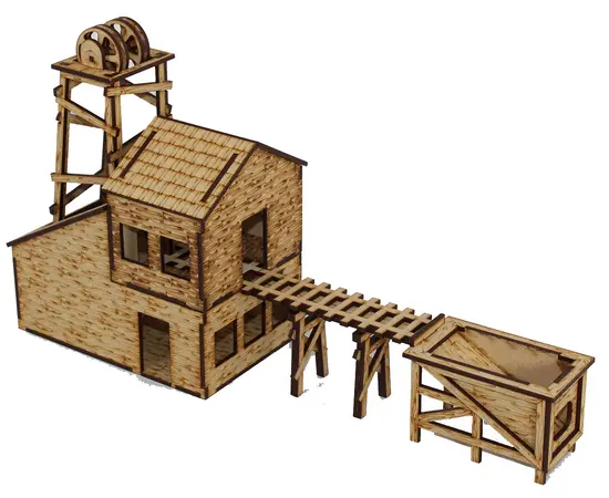 Our Mine kit includes a tall (8.5 inch) winding tower with sheltered hoist room and second story cart loading on a 6-1/2 by 4-1/4 inch base. The cart loading room attaches to a separate mine railway leading to a spoils dump with a foot print of 9-1/4 by 2-1/2 inches. The rail has nearly 2-1/2 inches of headroom allowing most models to be placed under it.