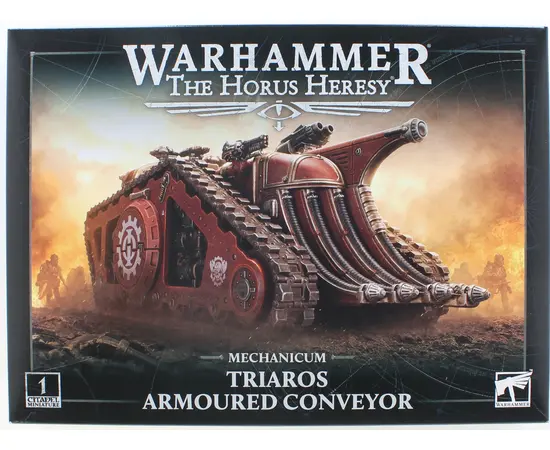 The Triaros Armoured Conveyor stands apart from anything seen elsewhere in the Imperium. Its thick armor, layered with techno-cant wardings and reinforced by energy shields, allows it to function in highly hostile environments while safeguarding its cargo of Tech-thralls from enemy fire as they are transported to the frontlines.This large, specialized transport boasts a capacity of 22 and is equipped with two volkite calivers, a twin-linked mauler bolt cannon, and options for two hunter-killer missiles. The set also includes a Mechanicum Macro-constructs transfer sheet with 394 transfers.