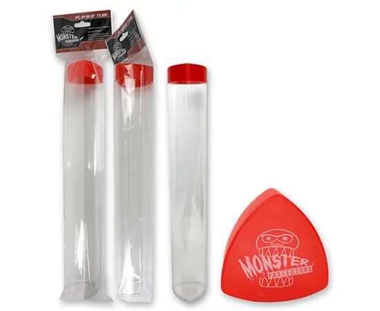 Monster Prism Matte Tube Red-Holds one standard size playmat-Unique prism shape allows for easy mat removal and stationary storage on any surface-Monster Logo on Cap-14 x 2 x 2 inches
