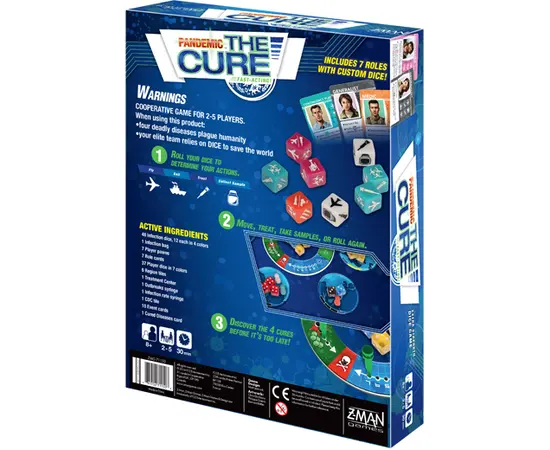 Pandemic: The Cure is a stand alone, dice-based version of classic cooperative Pandemic board game. Just like the original, you win or lose together as your team travels the globe treating diseases and keeping hot spots in check while researching cures. In this version, though, rolling dice determines everything from the outcome of your actions to the behavior of diseases. Each character has both a unique ability and a set of dice you roll at the start of each turn. Depending on the results, you can fly or sail between population centers, treat diseases in your region, collect samples for further study, or exchange information with other players. Try for the perfect turn by rerolling your unused dice, but each biohazard symbol that comes up brings you one step closer to the next epidemic.