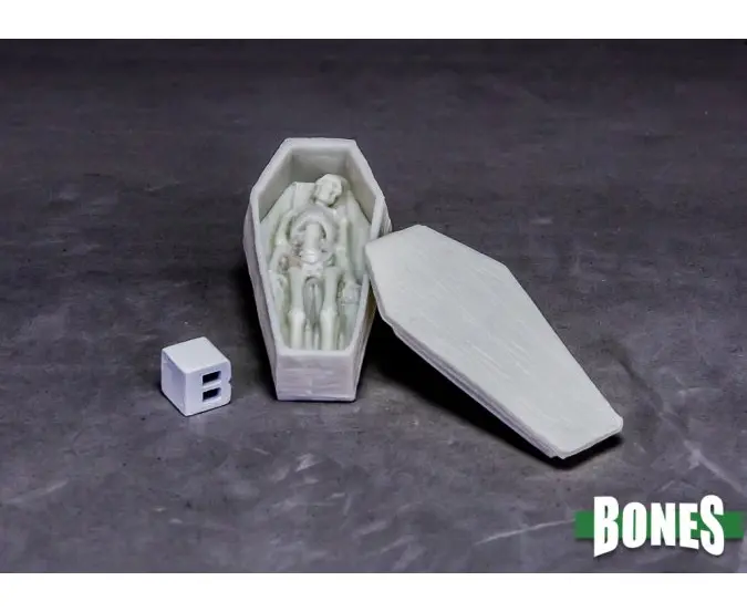 Reaper Bones: Coffin And Corpse is part of the Reaper Miniatures Bones line. The Repaer Miniatures Bones material is a polymer plastic. Reaper Miniatures Bones figures are as detailed as metal figures, for a much lower cost.