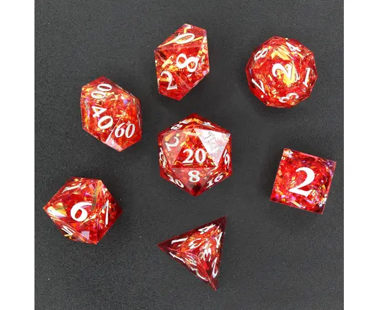 This set of polyhedral dice are cast in transparent red resin, inked with white on every number. Suspended inside every die are tiny strips of pearlescent-like ribbon causing every roll to shimmer.