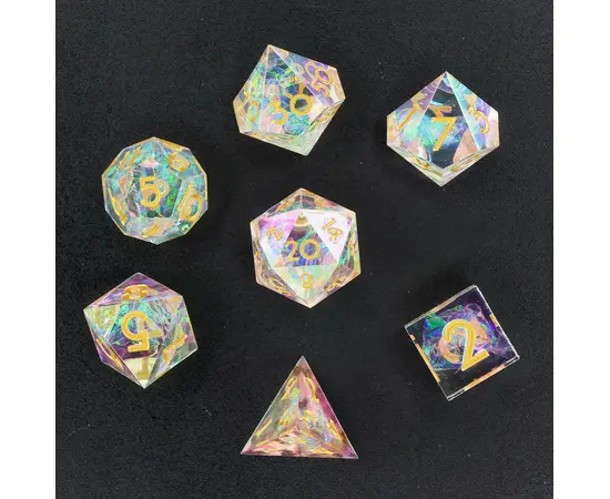 This set of polyhedral dice are cast in transparent clear resin, inked with gold color on every number. Suspended inside every die are tiny strips of pink pearlescent-like ribbon causing every roll to shimmer.