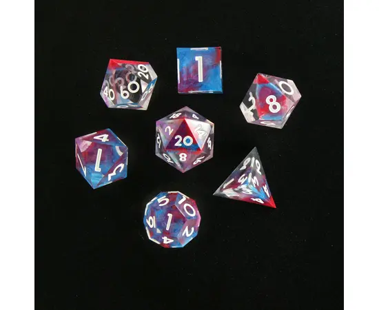 This set of polyhedral dice are cast in transparent clear resin, inked with white on every number. Inside every die are splashes of vibrant red and blue colors.