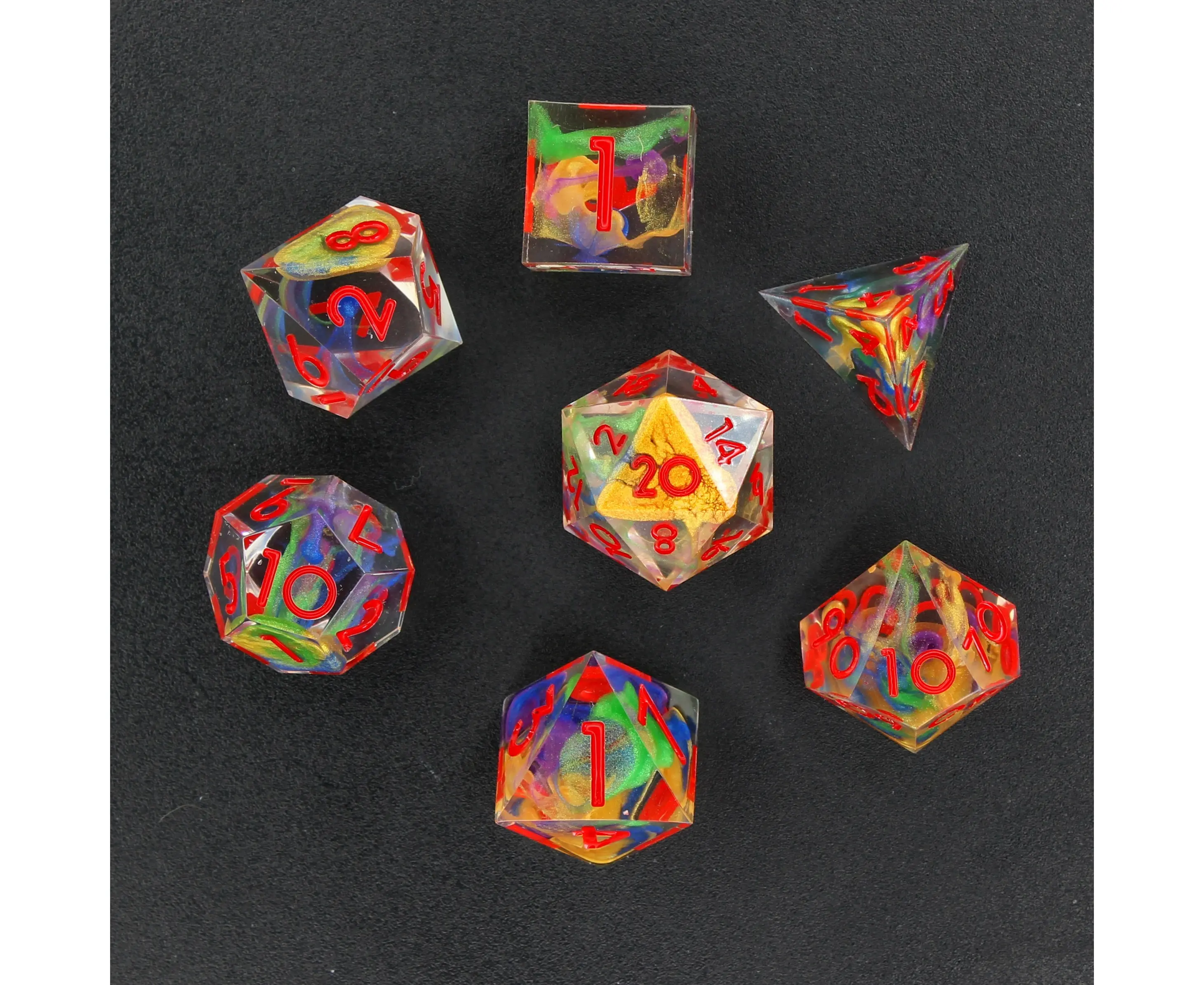 This set of polyhedral dice is cast in transparent clear resin, with every number inked in red. Inside each die are splashes of vibrant color.