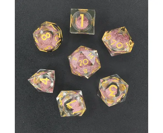 This set of polyhedral dice are cast in transparent clear resin, inked with gold color on every number. Inside every dice is a liquid core that suspends pink glitter to ensure every roll sparkles.