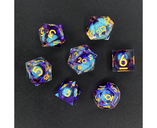 This set of polyhedral dice is cast in transparent clear and purple resin, with every number inked in gold. Inside each die is a liquid core that suspends blue glitter, ensuring every roll sparkles.