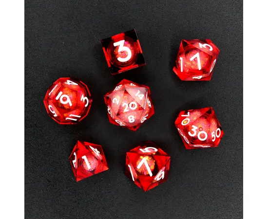 This set of polyhedral dice is cast in transparent red resin, with each number inked in white. Inside each die is a liquid core that suspends glitter, ensuring every roll sparkles.