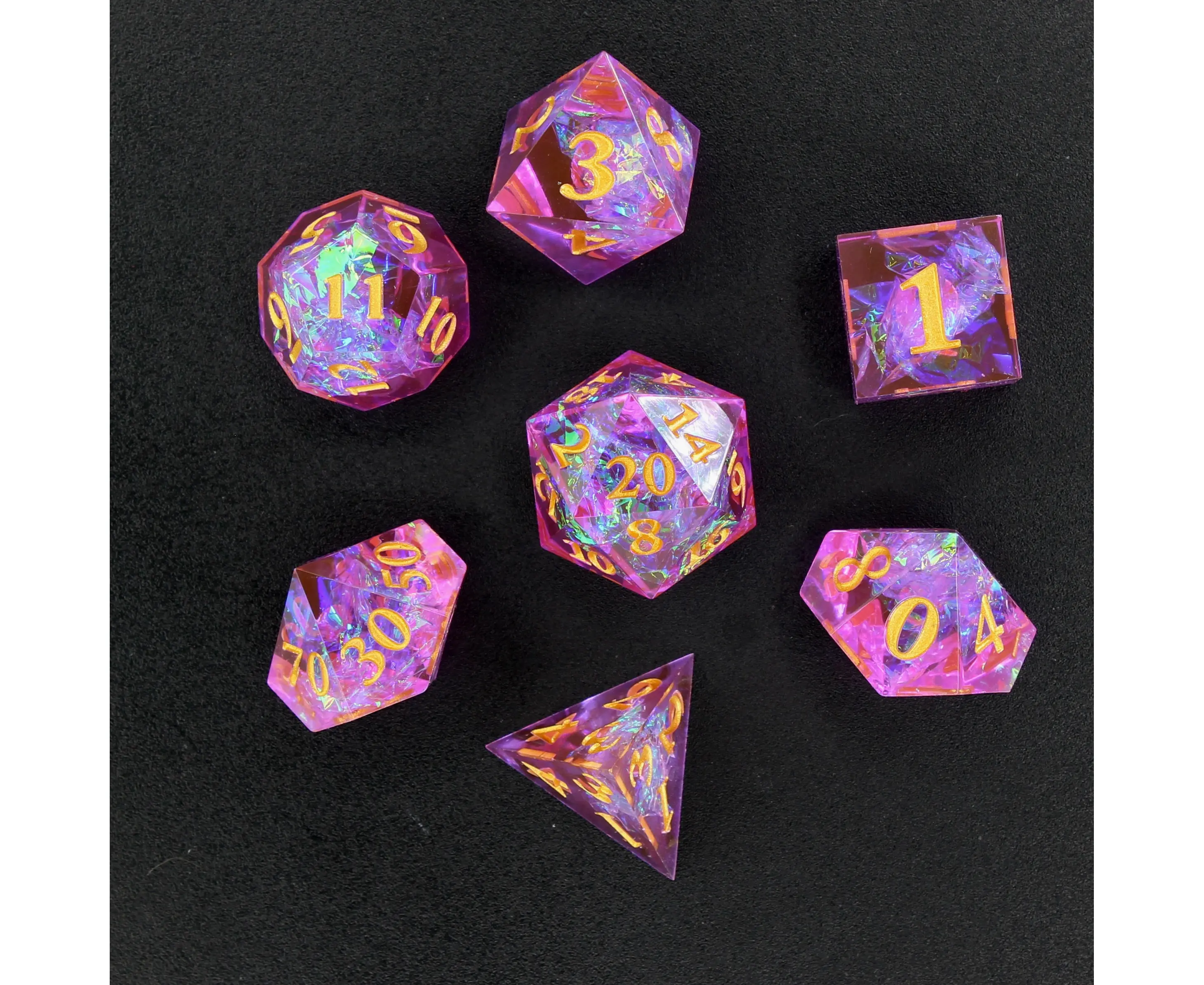 This set of polyhedral dice is cast in transparent pink resin, with every number inked in white. Suspended inside each die are tiny strips of pearlescent-like ribbon, causing every roll to shimmer.