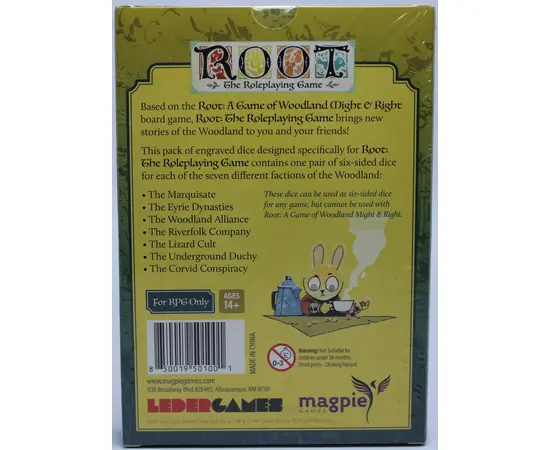 This pack of engraved dice designed specifically for Root: The Roleplaying Game contains one pair of six-sided dice for each of the seven different factions of the Woodland.