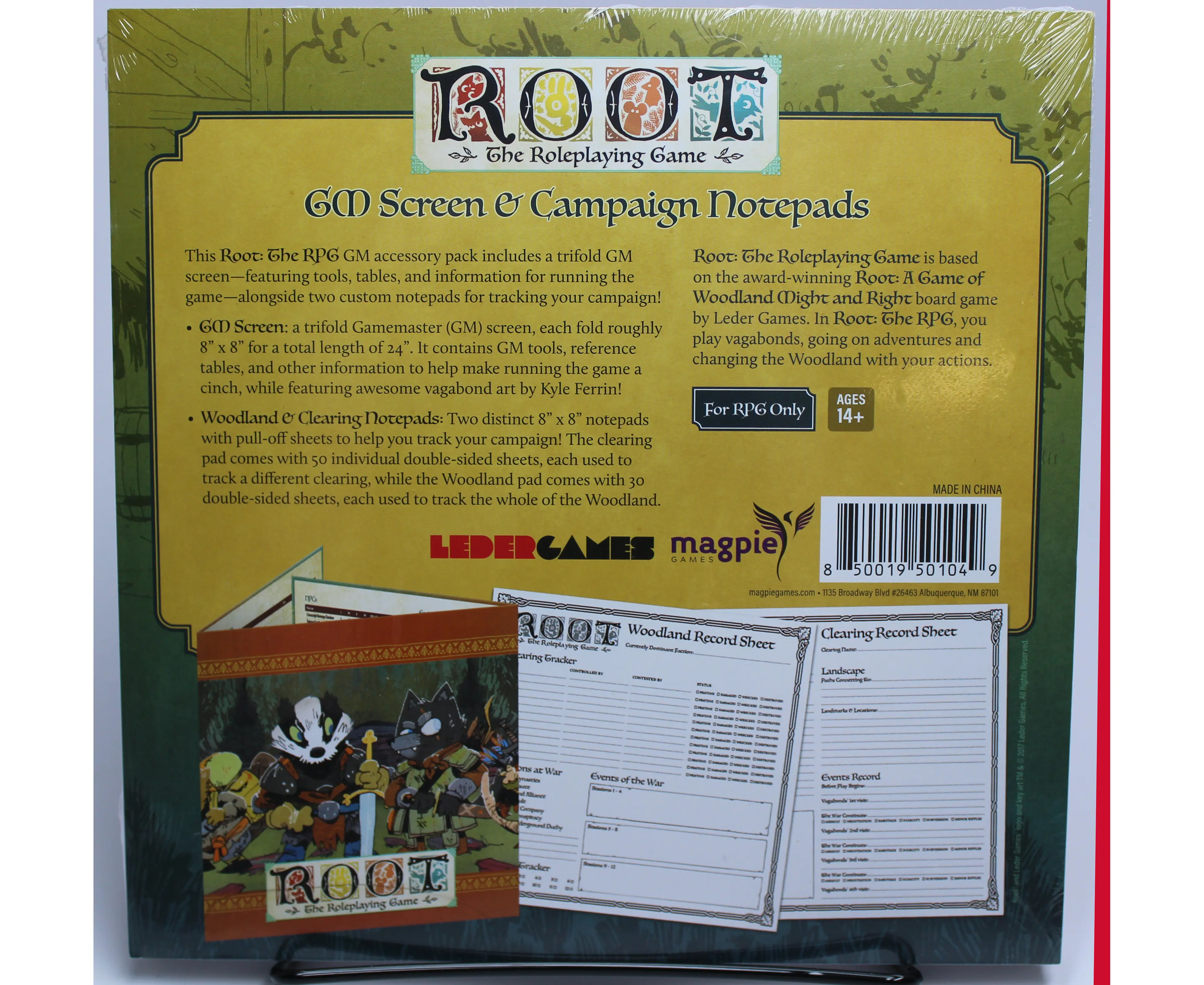 This Root: The RPG GM accessory pack includes a trifold GM screen featuring tools, tables, and information for running the game, alongside two custom notepads for tacking your campaign!