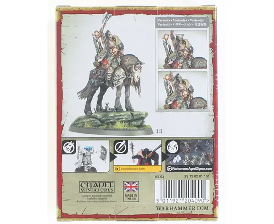 The Darkoath Chieftan on Warsteed is ready to lead your Darkoath cavalry. Leaders who relish charging headlong into battle to swiftly fulfill their oaths often choose to ride loyal warsteeds, blending the prowess and might of a Darkoath champion with the swiftness and agility of their mounts. This multipart plastic kit includes two weapon options—axe or sword—and three head variations for customization. Additionally, you have the option to adorn your steed with a bladed headpiece, further enhancing its formidable presence on the battlefield. This model is supplied unpainted and requires assembly.