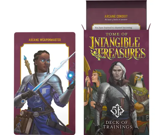 A deck of 60 tarot-sized reference cards for each of the advanced and epic trainings found within Tome of Intangible Treasures. These cards can be used independently of the book, though they work best alongside it as reference cards and handouts for players. The cards are gorgeously illustrated with portraits of characters and scenes representing each training.