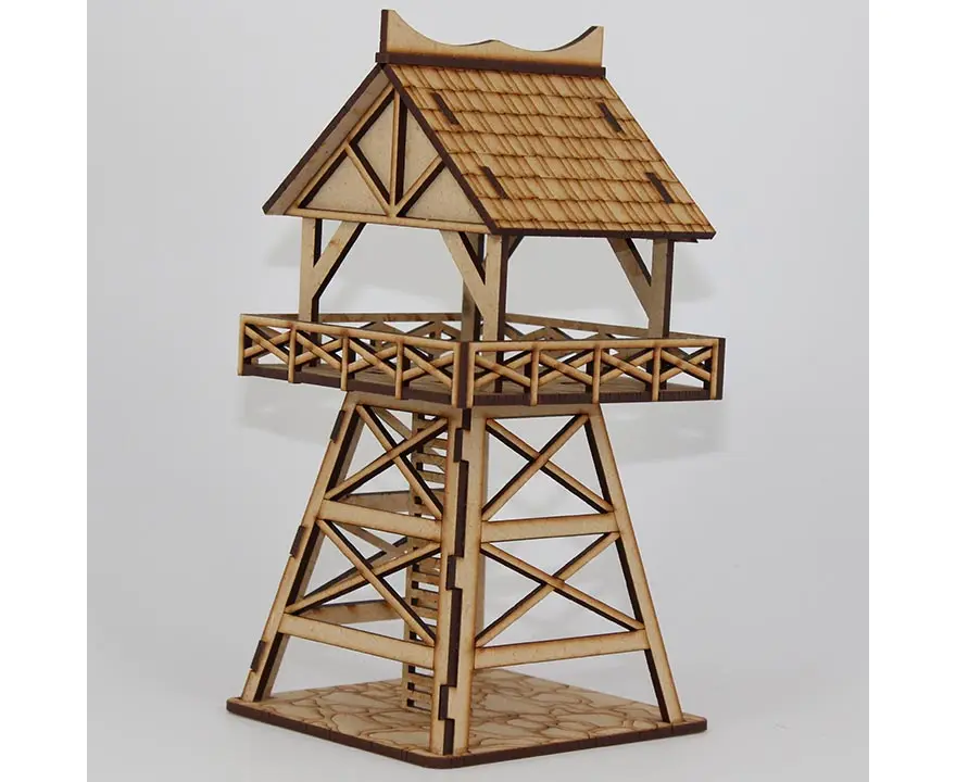 The Watch mans towers around the village perimeter ever vigilant against marauders or monsters. Designed for 28mm miniatures. Made of sturdy 3mm MDF board. Kits ship unassembled and unpainted.