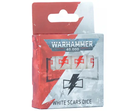 Speed into battle with the White Scars Dice Set, featuring striking pearlized white dice with bold red pips and the Chapter’s proud icon on the six face. Each pack contains 16 six-sided dice.